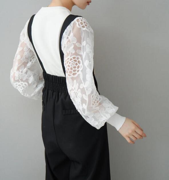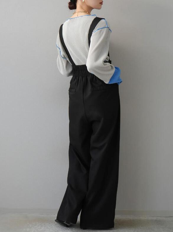 ニットやブラウスとの重ね着でおしゃれなサロペットコーディネートが完成。
