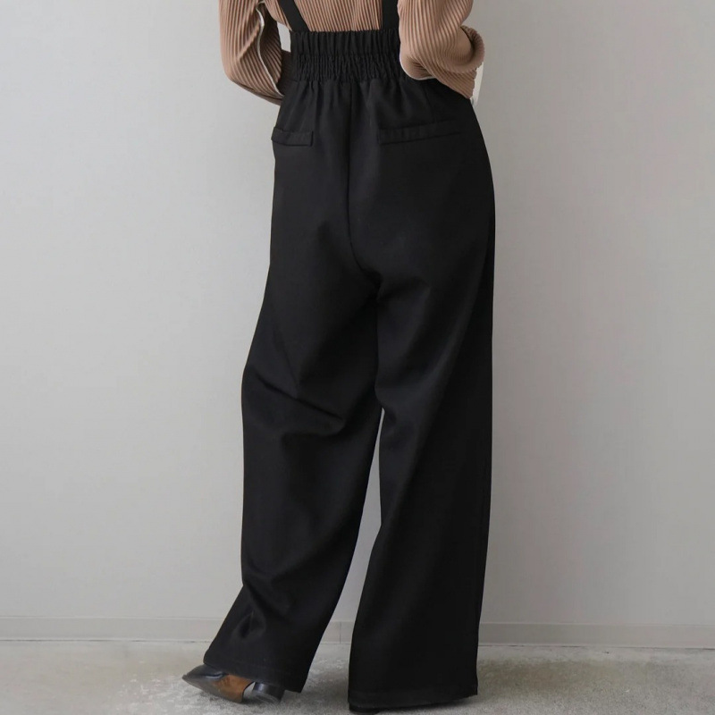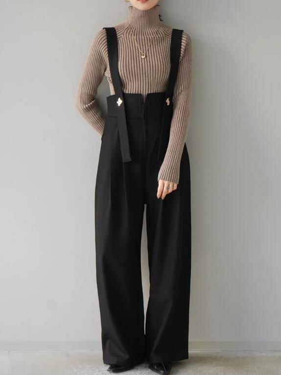 シックな黒色のオーバーオールで大人っぽいスタイルを演出。