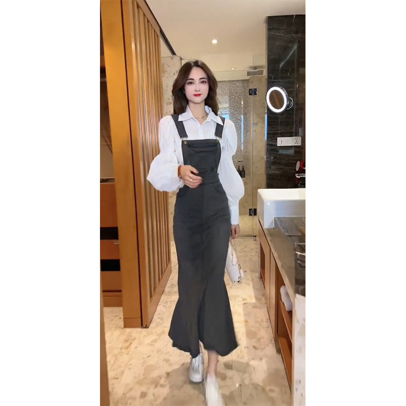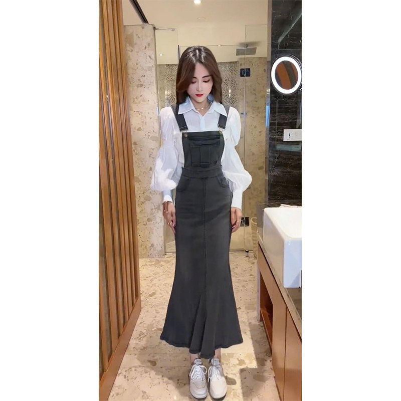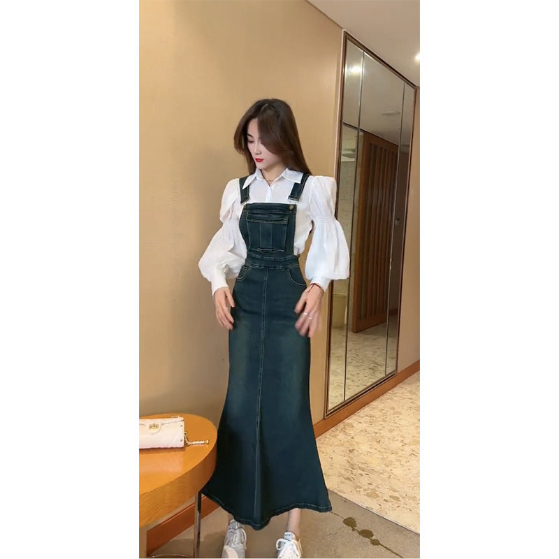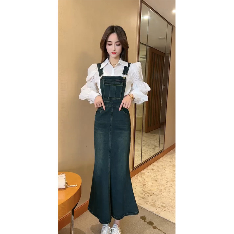 裾に向かって広がるマーメイドシルエットが美しいデニムサロペットです。