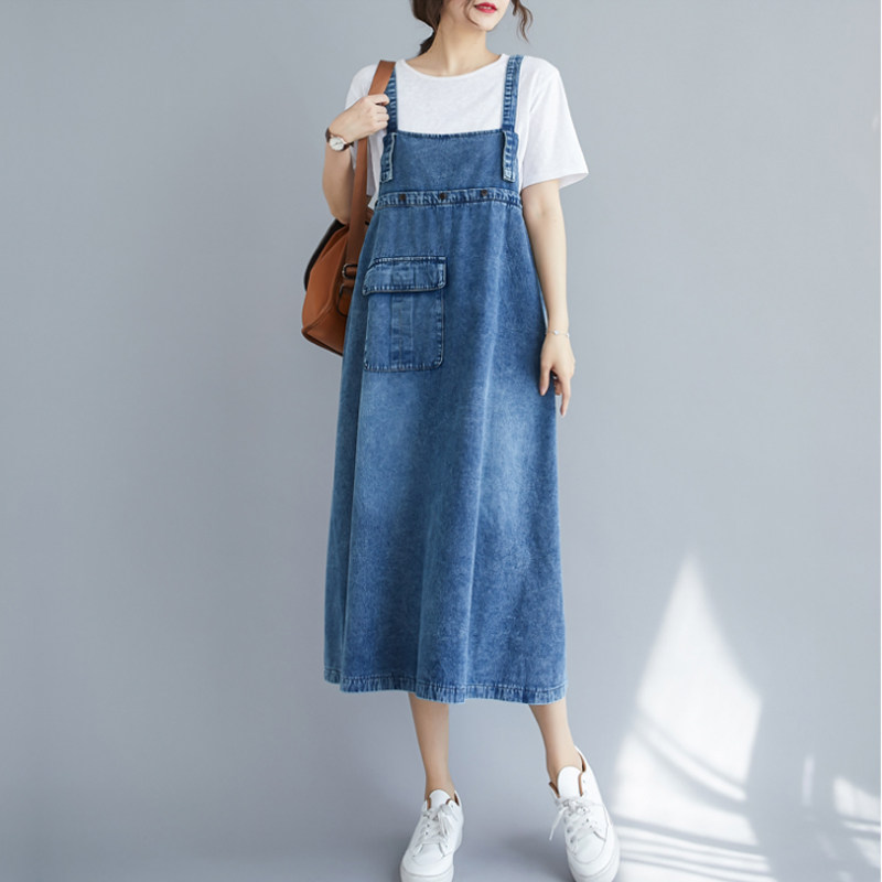 ナチュラルで優しい雰囲気が魅力のサロペットワンピースです。 デニム素材の風合いを活かしたミディアム丈で、リラックス感のあるゆったりシルエットが特徴です。 胸元の切り替えデザインと調節可能な肩紐で自分好みの着こなしが楽しめます。 フロントポケット付きで実用性も兼ね備え、一枚でこなれた印象を演出します。 白の半袖との重ね着でカジュアルスタイルを完成させられる万能アイテムです。